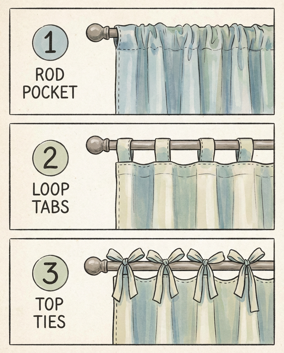 Hanging Style: Loop tabs, Top ties, Rod pocket